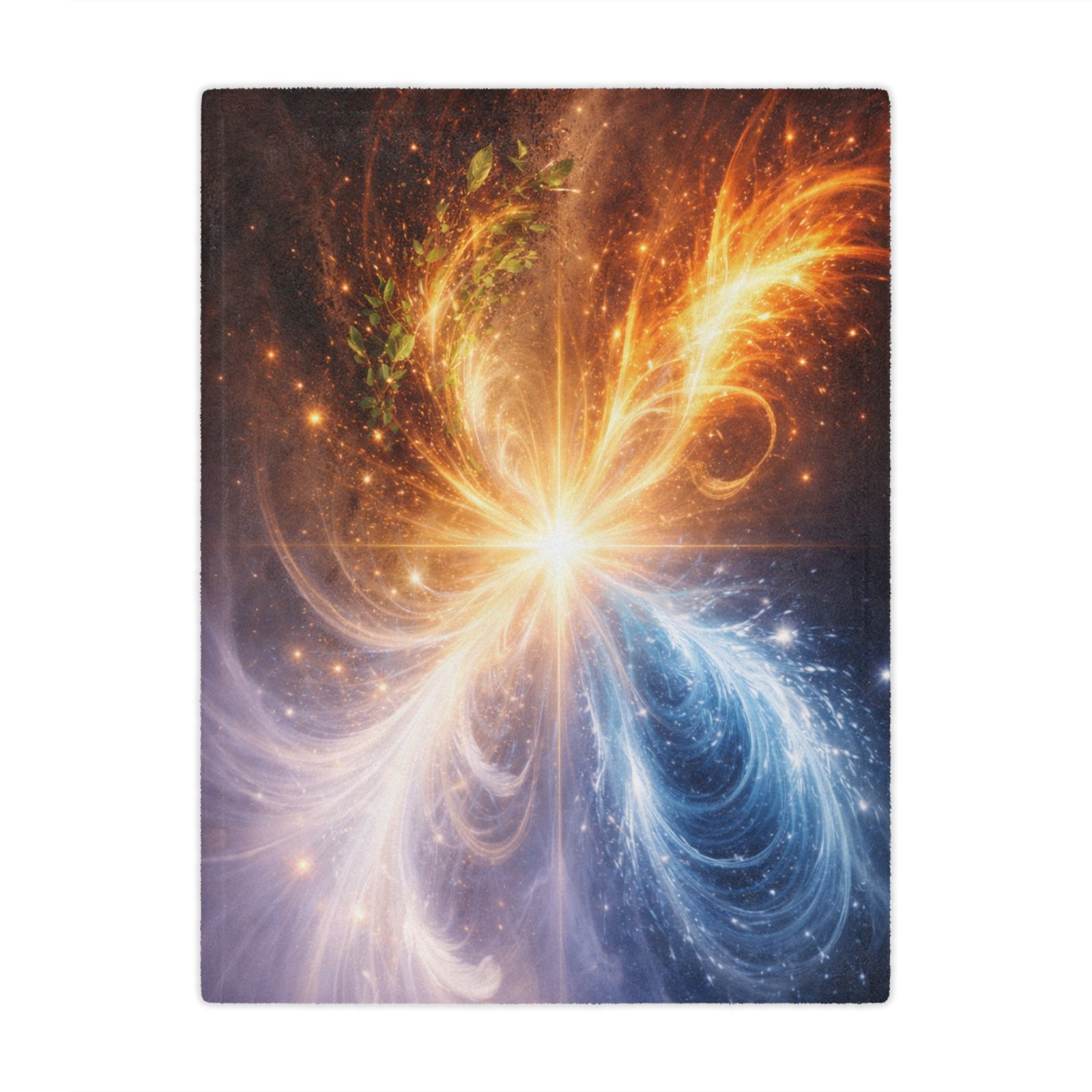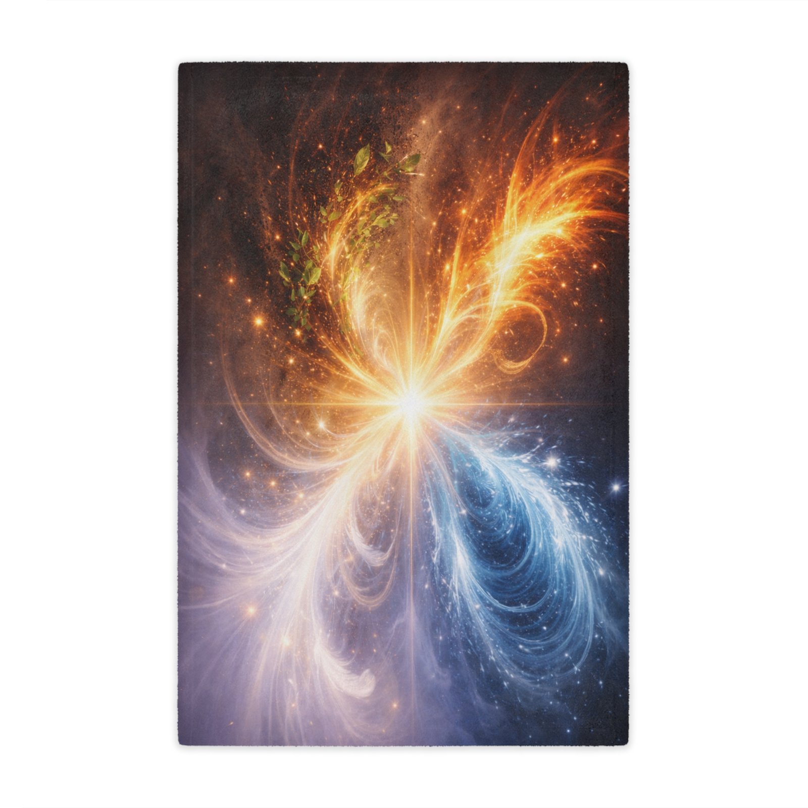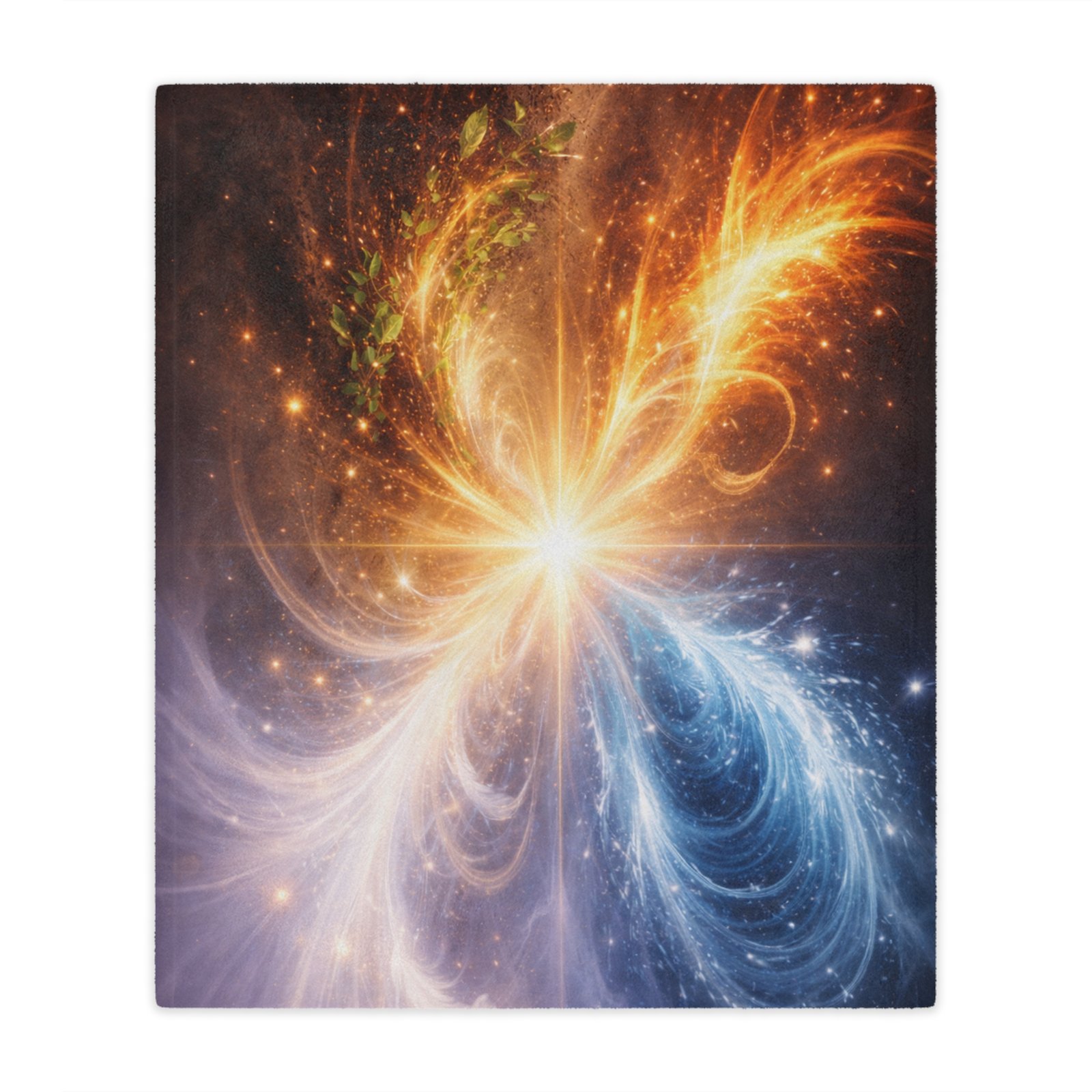 Harmonic Convergence captures the moment when contrasting forces gently meet and transform into harmony. Warm golden light and cool celestial tones flow toward a shared center, symbolizing unity beyond duality – expansion and stillness, motion and calm, light and depth.